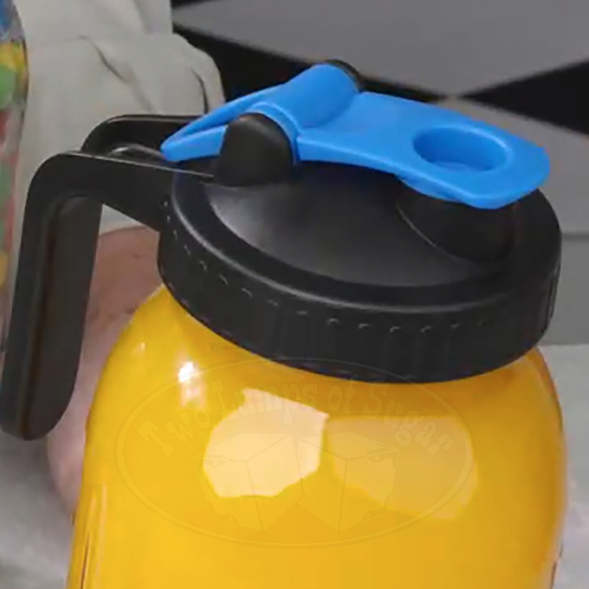 The Two Lumps of Sugar Lid With Handle Wide Mouth Royal (1-pack) is a sleek, BPA-free plastic lid that is universal to all branded wide-mouth Mason Jars. Featuring a convenient handle for easy carrying, a locking pour spout, and a leak-proof silicone inner gasket, our durable, dishwasher-safe lid ensures an airtight seal, perfect for storing dry goods, snacks, or beverages on the go. Add style and functionality to your kitchen with this versatile canning jar accessory.\n\n\n\n